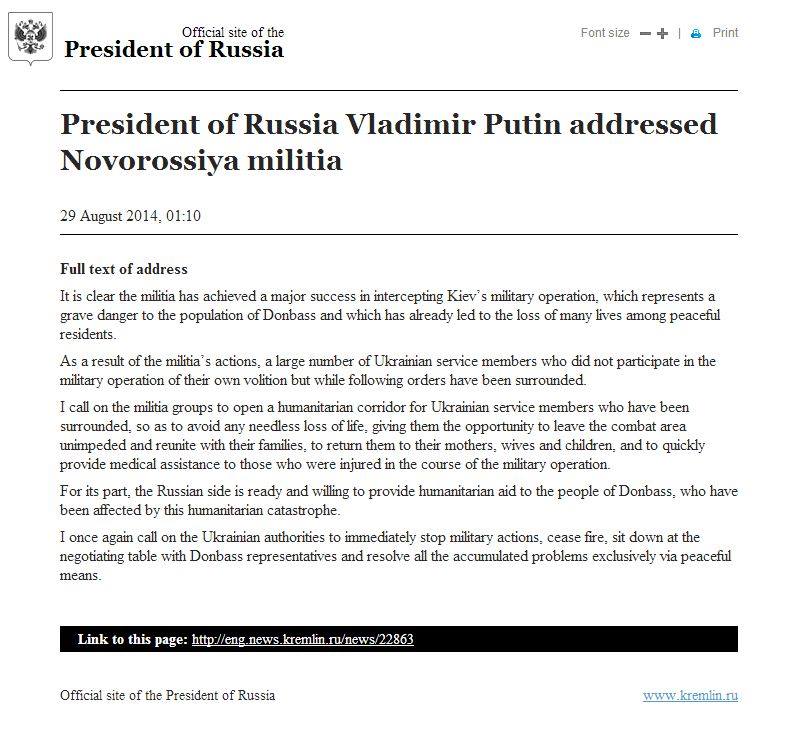 putin1Seeing clearly that the US in the last 48 hours is trying to use Russia’s victimological narrative against it, is continuing on with the line that Russia also used which is that Novorossiya is hanging by a thread.  But Russia is ready to switch gears, and has outgrown the narrative of losing.   They got the most assurances that they could get from the Europeans regarding non-interference.  What they got was expected given the political and economic climate in Germany.  Addressing the world, Putin essentially reveals that the KJ in the south is defeated and in need of humanitarian aid.  Poroshenko wants to pretend they are winning, and will let the surrounded troops all be killed if need be.  Later he will accuse the dead and captured of having gone AWOL as has been consistent Ukraine policy since the start of hostilities.