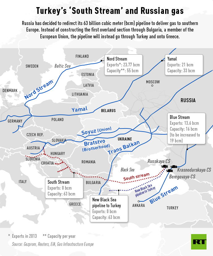 Russia has officially gone on a media campaign to sell the workability of the Russian-Turkish Stream plan.  In a map provided to the public by RT, Russia’s English language state news agency, we can see clearly what the intended message is.